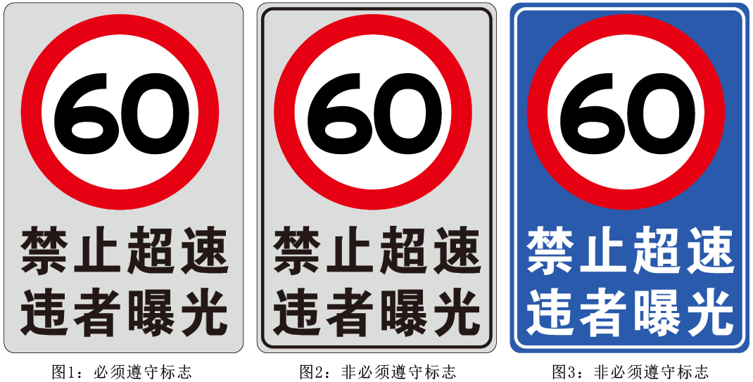 依据国标《道路交通标志和标线之交通标志》(GB5768.2-2022版)(以下简称“《国标5768》”)之4.26条所述“除停车让行标志和减速让行标志外的禁令标志、指示标志套用于白色无边框的底板上,为"必须遵守标志"。”,言下之意,其它情况,若加了“边框”,或套用于其它颜色的底板上,则为“非必须遵守标志”,仅为提供相关交通信息,作为补充说明或预告,不能作为行政处罚依据。所以,对于套用的标志版面来说,底板整体是否有边框,成为“必须遵守”和“非必须遵守”标志的关键评判标签。如下图: